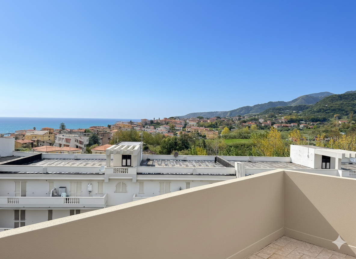 Dwupoziomowe mieszkanie na sprzedaż w Belvedere Marittimo, położone przy Corso Europa, zaledwie 300 metrów od morza i 400 metrów dzieli nieruchomość od centrum handlowego „Il Tirreno”.